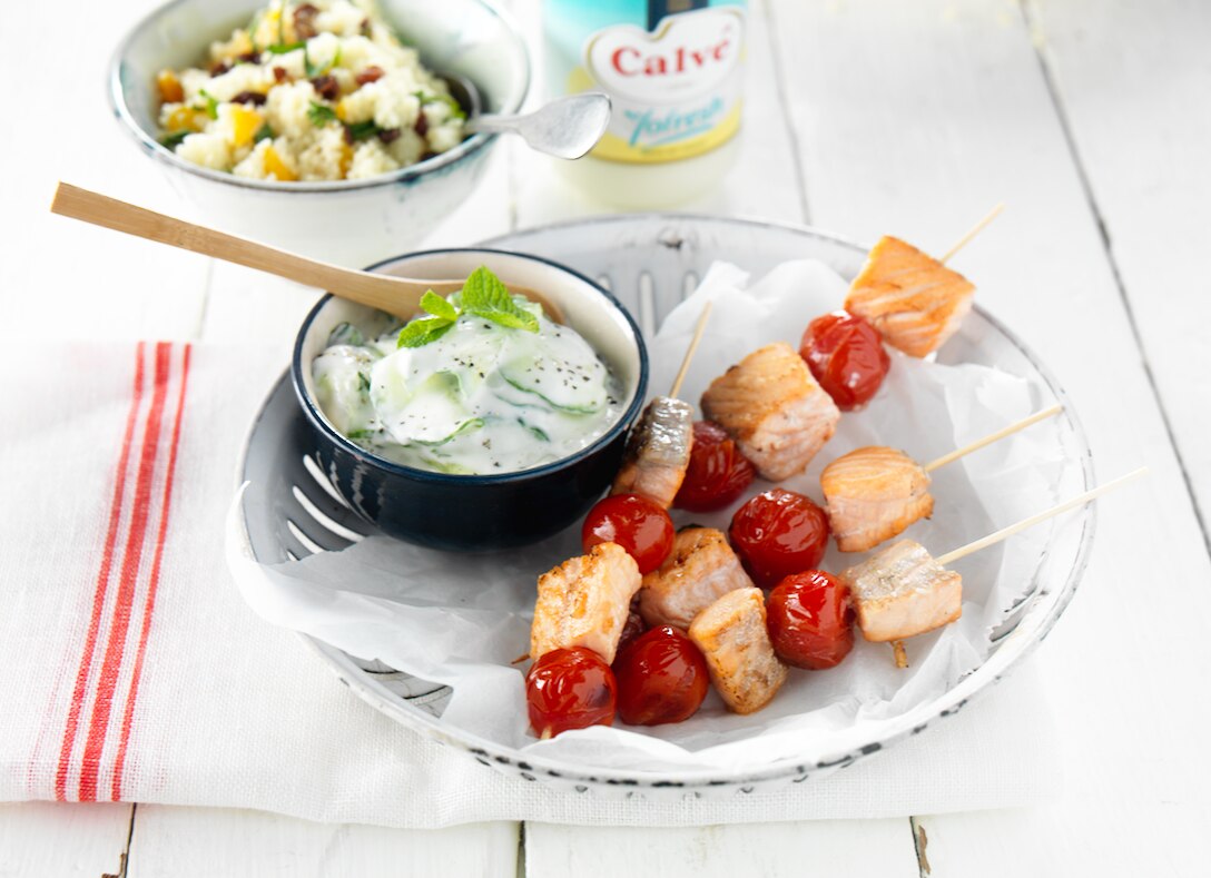 Serveer de couscous met de zalm en de tzatziki.